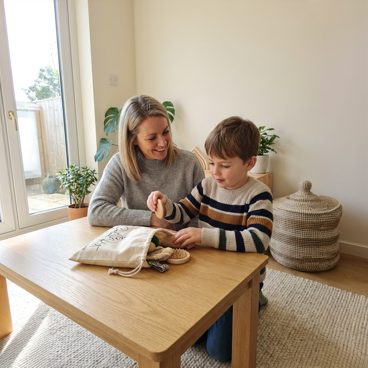 The pouch is designed for everyday essentials such as small toys, books, earphones, textured objects, snacks, or personal items.